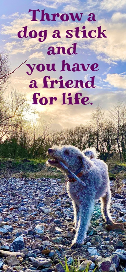 Paused on the bridge to watch some spotty trout meander across the river looking for breakfast morsels. My bearded bloke informs me that there is a hatch of Sedges- as if that means anything to me; but if you are a fly fisher then you are in the know. Headed down the first field. Spotted a bunny and gave chase. I let him win; half my family are vegetarians so they wouldn’t appreciate my furry food parcel anyway! Scattered a shoal of minnows when I had my first dip. The water was cool as I waded out up to my small bits- not that I have any. Am considering setting up a trauma group for like minded canines that like me were parted from their genitals without even a consultation. Think I will call it “Wish They Were There.” or maybe “Nothing To Be Sniffed At.”