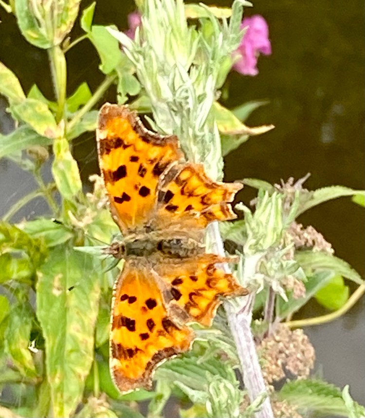 Spotted my bearded bloke staring at a flower. That damn Himalayan Balsam that is now the scourge of the river bank. In one hand he was holding a bag full of litter that someone had left on the bank. Luckily I had missed him muttering his usual “Why do they do it? It weighs less now than when they carried it down!” (or words to that effect.) He has a valid point though. In his other hand he was pointing his phone at something which to him was obviously interesting. I sauntered over and was immediately unimpressed . “Wow! It’s a butterfly.” I stared my point of view at him hoping he would detect the sarcasm in my eyes. I think he caught my drift. It’s a Comma, he reliably informed me and he took a picture- remarkable in itself because normally by the time he has worked out which angle and how close he should get, the subject has got bored or simply had somewhere else to be. I thought it strange that this little fella should be named after a punctuation mark (whatever that is.) It’s to do with the comma like markings on the underwings; thanks for asking.