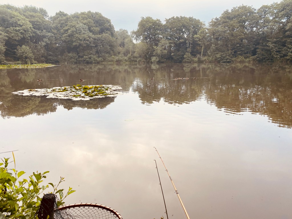 The pond is an old clay pit. Back in the 60’s Dick Walker and Jack Hilton; two of angling’s finest ambassadours tested their carp fishing skills here. This was when it was believed that fishing for carp was a complete waste of time- because they were uncatchable. Mike Winter, a local angling legend regaled to me many a story of his encounters with the lake and as I stand and drink in the atmosphere I like to think that somewhere in the swirling mists the ghosts of Dick, Jack and Mike are watching over the lake and perhaps their spirits are flowing through the green tea tinged water.